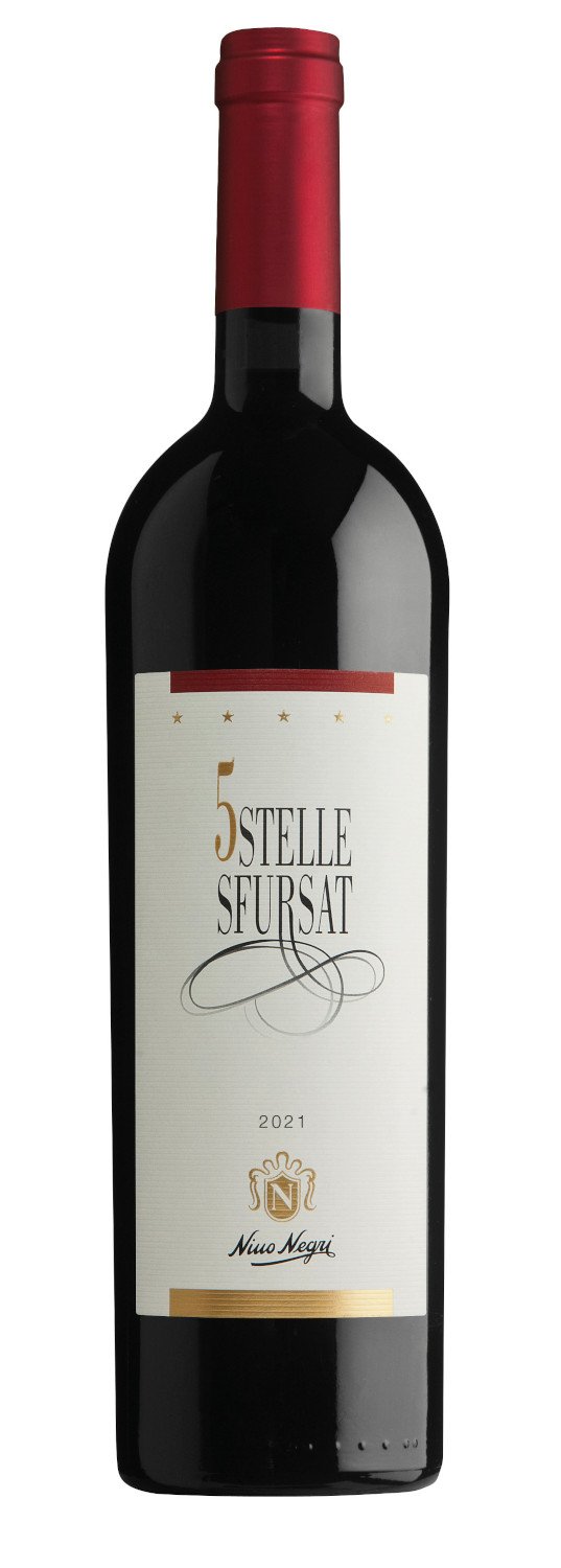 Un vino con una struttura e un corpo importanti, un profumo lungo e persistente con pochi pari. Con lo Sfursat si comprende appieno cos'è un "vino da meditazione": morbidezza, profondità, corpo, illimitatamente espansivo, adatto sempre, dentro e fuori il pasto. Prodotto solo in condizioni stagionali ottimali, è speciale non solo per la qualità del vitigno, per i metodi di allevamento e di raccolta, ma anche per lo stesso processo produttivo che prevede un appassimento naturale delle uve per circa tre mesi prima della vinificazione. Lo Sfursat 5 Stelle deriva da un'attenta selezione dei grappoli di Nebbiolo raccolti a mano e riposti in cassette da 4kg in un solo strato. I grappoli vengono poi fatti appassire in modo naturale nel fruttaio, perdendo circa il 30% del loro peso. Lo Sfursat 5 Stelle ha un colore granato di media intensità, profumi unici di frutta matura e di spezie dolci che si sviluppano grazie alla tecnica dell'appassimento. Gusto estremamente bilanciato, ricco e corposo. Il sapore è concentrato, vigoroso, intenso e piacevole, con un aristocratico fondo di mora matura e spezie. Finale persistente di frutta matura.
